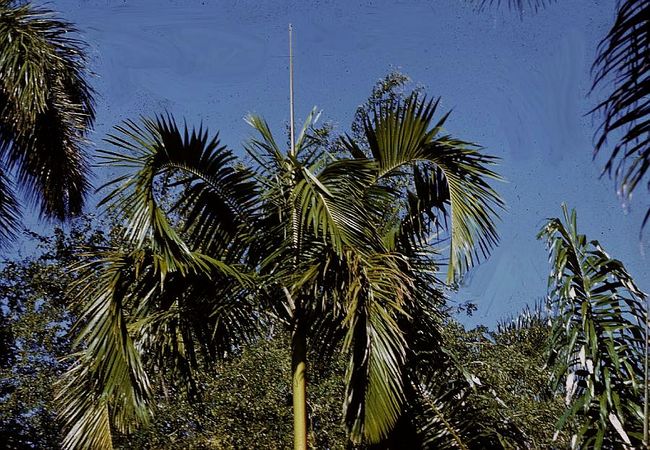 - Slender, solitary trunk with a conical mass of aerial roots at the base, topped by a pale green crownshaft and arching, pinnate leaves